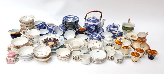 Ensemble de faiences et porcelaines dures émaillées polychromes comprenant : deux parties de services à thé-café à décors divers (lambrequins dorés sur fond vert et blanc pour l'un, frises de lambrequins et rinceaux à rehauts d'or sur fond bleu nuit pour l'autre), 1 partie de service à café à motif de trèfles stylisés formant une frise sur fond blanc, tasses et sous-tasses de différents modèles, une dinette à décor d'enfants, parties de services à dessert sur diverses thématiques (décor floral, assiettes parlantes, nature morte aux fruits ...), 1 ensemble de forme hexagagonale avec verseuse, coupes sur piédouche et plateau à décor de fruits