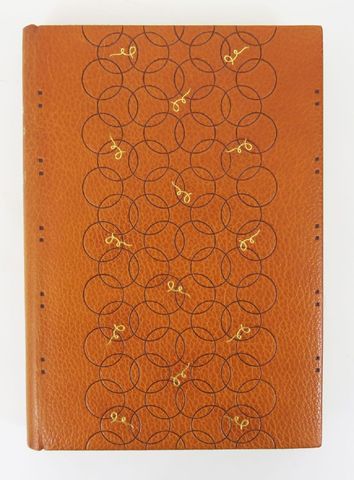 In-4 maroquin fauve, dos lisse orné du titre et de rubans de filets dorés, plats ornés d'une large bande verticale de cercles à froid se croisant et de petits rubans de filets dorés, et de 5 paires de carrés à froid aux extrêmités, encadrement intérieur du même maroquin avec listel de mar. légt plus foncé, filets doré et à froid, doublures et gardes de moire mordorée, couv. et dos conservés, sous étui à rebords (Georges Cretté).