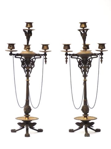 Paire de candélabres en bronze à patine brune et dorée éclairant à 4 feux et 3 bras de lumière composés de bobèches et binets ornés de motifs stylisés et retenant des chaînettes, fût cannelé surmonté d'un aigle en ronde-bosse aux ailes déployées et de trois médaillons de femmes représentées à l'antique en partie inférieure, base tripode terminée en griffes