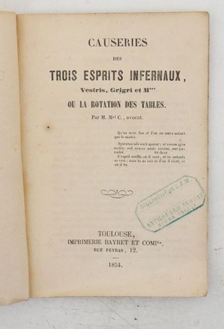 [CÉREN (Marcel)]. Causeries des trois esprits infernaux, Vestris, Grigri et M***, ou La Rotation des tables. Par M. Mel C, avocat. Toulouse, Imprimerie Bayret, 1854.