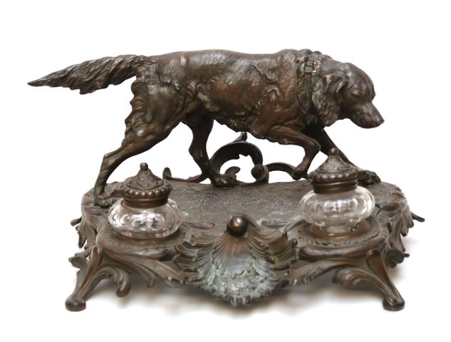 Encrier en régule patiné surmonté d'un setter à l'affût reposant ...