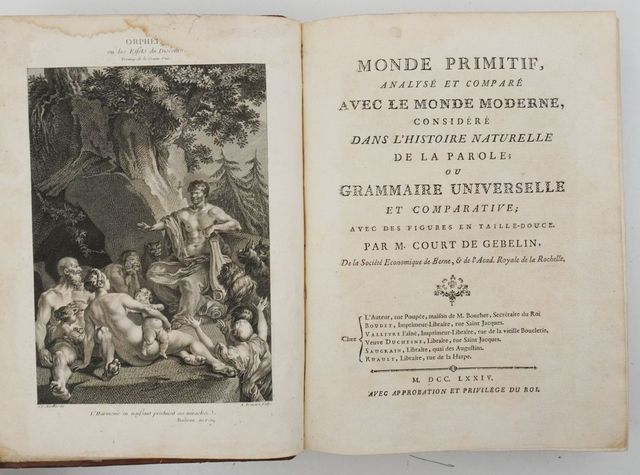 COURT DE GEBELIN (Antoine). Monde primitif, analysé et comparé avec le monde moderne, considéré dans l'histoire naturelle de la parole ou Grammaire universelle et comparative. [Paris], Chez l'auteur, Boudet, Valleyre l'aîné, Veuve Duchesne, Saugrain, Ruault, 1774.