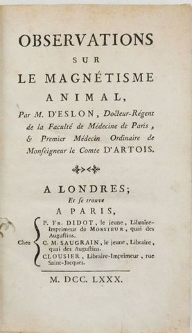 DESLON (Charles-Nicolas). Observations sur le magnétisme animal. Londres, et se trouve à Paris, P. Fr. Didot, C. M. Saugrain, Clousier, 1780.
