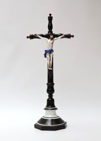 Christ sur sa croix en bois et porcelaine émaillée à décor polych...
