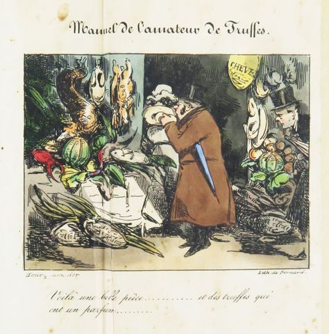 MARTIN (Alexandre). Manuel de l’amateur de truffes ou l’art d’obtenir des truffes au moyen de plants artificiels, dans les parcs, bosquets, jardins, etc, etc. ; précédé d’une histoire de la truffe et suivi d’un traité sur la culture des champignons. Paris, Leroi et Audin, 1829. In-12 de (4)- XII-143 pp., toile grise, dos lisse, p. de titre en mar. rouge, titre en long, signet de soie tricolore, blanc, jaune rose. Bien complet du frontispice dépliant lithographié et colorié de Henry Monnier ; la scène se passe chez le célèbre traiteur installé au Palais-Royal, Chevet, qui s'était fait une exclusivité de produits rares : ‘Voilà une belle pièce… et des truffes qui ont un parfum’. Roussseurs. (Vicaire 569 ; Carteret III, 402, Bitting, 312, pour la première édition.)