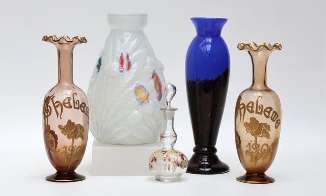 Lot de pièces dépareillées en verre émaillé, verre opalescent et pâte de verre comprenant une paire de vases en verre fumé à décor émaillé or et rouge de fleurs de la distillerie de l'Abbaye de Theleme datés 1900 et 1901 (H. 28 cm), un vase en verre à décor intercalaire violine sur fond bleu (H. 32 cm - éclat au col), un vase piriforme en verre dans le goût de Murano à décor en relief et fleurettes polychromes sur fond blanc (H. 26,5 cm), un flacon en verre incolore à décor floral émaillé polychrome (H. 19,5 cm)