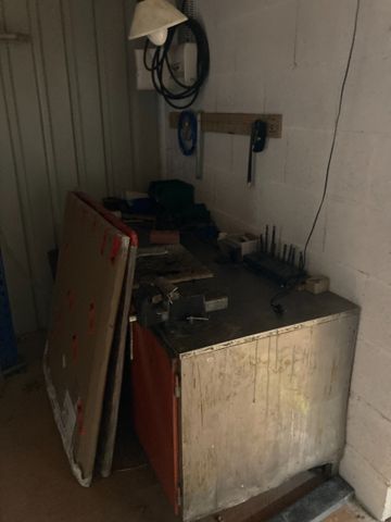 Lot comprenant 1 établi, 1 table, 2 étagères et meubles de rangem...