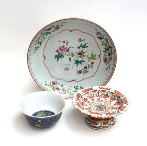 Coupe circulaire sur talon en porcelaine et émaux de la famille rose à décor de pivoines au centre dans une réserve polylobée, l'aile décorée de trois bouquets de fleurs