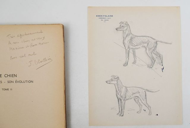 Exemplaire enrichi d'un E.A.S. de Joseph Oberthur à ses neveux et de 14 feuillets de nombreux CROQUIS ORIGINAUX non signés, à la mine de plomb, le premier sur papier à entête de la dernière adresse de Joseph Oberthur (Eden-Falaise, Cancale), représentant essentiellement des chiens, mais également des bécasses, des mouettes et oiseaux marins et un cerf (sur calque).