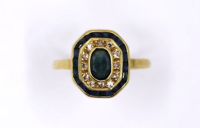 Bague en or jaune 750°/°° ornée d'un saphir au centre entouré de ...
