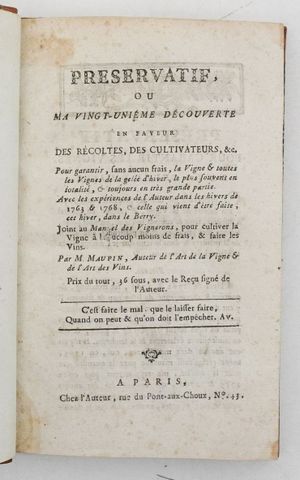 MAUPIN. Préservatif, ou Ma vingt-unième découverte en faveur des récoltes, des cultivateurs, &c. Pour garantir, sans aucun frais, la vigne & toutes les vignes de la gelée d'hiver, le plus souvent en totalité, & toujours en très grande partie. Avec les expériences de l'auteur dans les hivers de 1763 & 1768, & celle qui vient d'être faite, cet hiver, dans le Berry. Joint au Manuel des vignerons, pour cultiver la vigne à beaucoup moins de frais, & faire les vins. Paris, chez l'auteur, sd (1789).