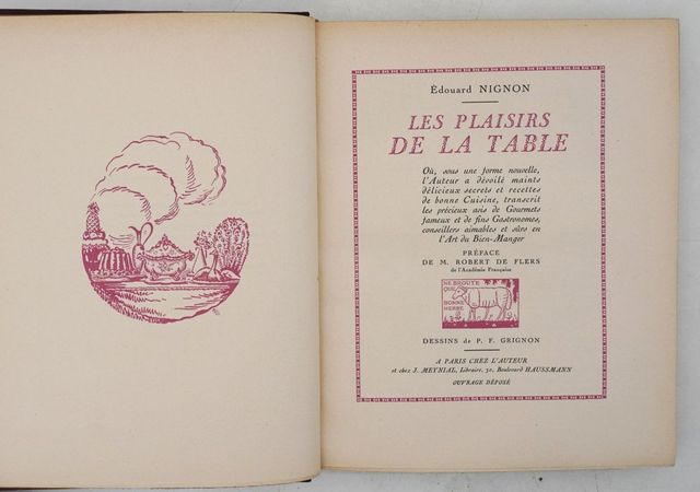NIGNON (Edouard). Les Plaisirs de la table. Où, sous une forme nouvelle, l'auteur a dévoilé maints délicieux secrets et recettes de bonne cuisine, transcrit les précieux avis de gourmets fameux et de fins gastronomes, conseillers aimables et sûrs en l'art du Bien-Manger. Préface de Robert de Flers. Dessins de P.-F. Grignon. Paris, chez l'auteur, et J. Meynial, sd (1926).