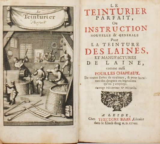 [ALBO (Jean)]. Le Teinturier parfait, ou Instruction nouvelle et générale pour la teinture des laines et manufactures de laine, comme aussi pour les chapeaux de toutes sortes de couleurs, & pour la culture des drogues ou ingrédiens qu’on y employe. Leyde, Haak, 1708.