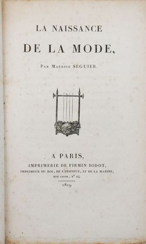 On y joint : SÉGUIER (Maurice), La Naissance de la Mode. Paris, Firmin Didot, 1819. In-8 de 38 pp. broché, couverture d’attente de papier rose (en partie passée), chemise moderne de papier rose à la colle, titre en rose au dos, lacets de cuir blanc (V. Fonlupt). Rousseurs éparses.