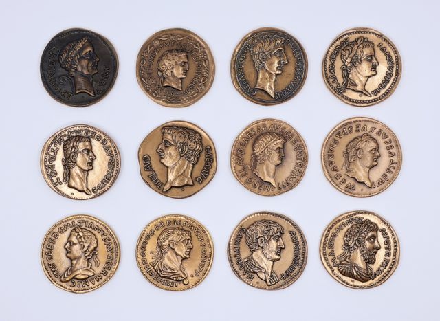 Suite de 12 reproductions de monnaies romaines en bronze frappées par l'Administration des Monnaies et Médailles à Paris et gravées par Raymond TSCHUDIN comprenant Jules César, Marc Antoine, Auguste, Tibère, Caligula, Claude, Néron, Titus, Domitien, Trajan, Hadrien, Marc Aurèle