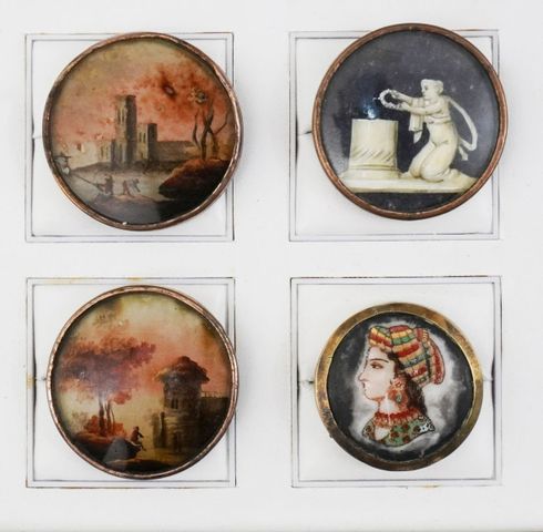 - bouton (31 mm) avec un portrait peint orientalisant d'une jeune femme au turban. Support et cerclage en laiton. XIXe s.
