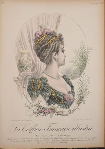 Complet des 12 numéros pour l'année 1891, illustrés de 35 (sur 36) planches hors texte, à raison de 3 planches par numéro (une planche couleurs de coiffure pour femme, une planche en noir de coiffures pour femme, et une planche en noir de coiffure pour homme) ; il manque la planche de la coiffure pour homme au n° 27. Bon état général pour cette revue peu courante.