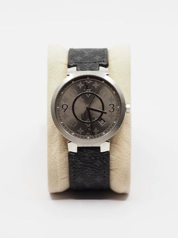Montre bracelet d'homme à boîtier rond en acier 39 mm, cadran gris métallisé monogrammé, chiffres romains pour les heures, guichet dateur à 4h30, couronne monogrammée, fond vissé monogrammé numéroté TK5096 Q1DM0, mouvement quartz, bracelet en toile Monogram à boucle ardillon en acier signée