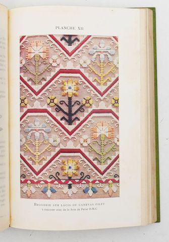 La Bible des travaux d’aiguille au tournant du siècle, illustrée de 17 planches hors texte en couleurs sous serpentes et de centaines de motifs textiles de différents pays en noir dans le texte. Rédigé par l’autrichienne Thérèse de Dillmont (1846-1890), l’ouvrage aborde toutes les techniques : couture à la main et à la machine, raccommodage, broderie, tapisserie, tricot, crochet, frivolité, macramé, filet, jours sur toile, dentelles, etc.
