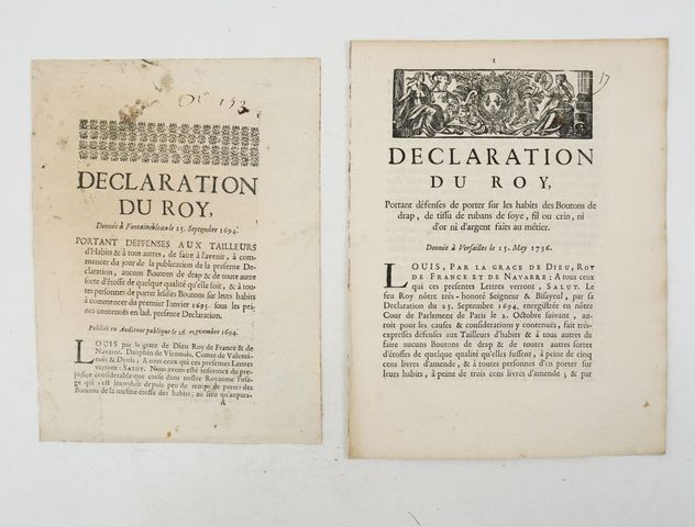 On joint la Déclaration du Roy portant défenses de porter sur les habits des Boutons de drap, de tissu de rubans de soye, fil ou crin, ni d’or ni d’argent faits au métier, donnée à Versailles le 15 may 1736 (4 pp. grand in-8 imprimées par Valfray), actualisant la précédente déclaration afin de lutter contre les importations de bouton “faits au métier”. Bons exemplaires.