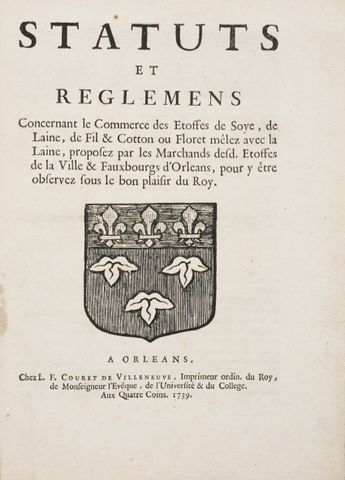 [Droit - Orléans]. Statuts et Règlemens concernant le Commerce des Étoffes de Soye, de Laine, de Fil & Cotton ou Floret mêlez avec la laine, proposez par les Marchands desd. Étoffes de la Ville & Fauxbourgs d’Orléans, pour y être observez sous le bon plaisir du Roy. Orléans, Couret de Villeneuve, 1739.