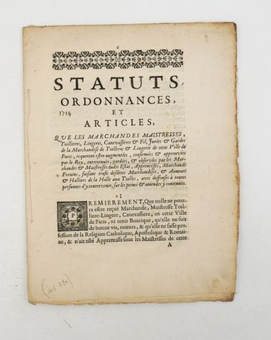 [Droit - Paris]. Statuts, ordonnances et articles, que les Marchandes maistresses, Toillières, Lingères, Canevassières & Fil, Jurées & Gardes de la Marchandise de Toillerie & Lingerie de cette Ville de Paris, requerent estre augmentées, confirmées & approuvées par le Roy. Paris, Imprimerie de Paulus-du-Mesnil, 1714.