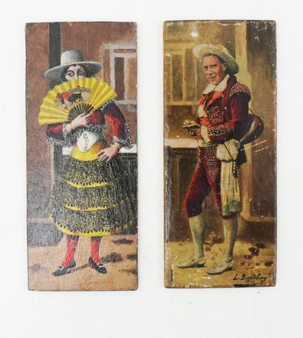 Gouaches originales représentant un homme et une femme en costumes traditionnels espagnols, portant tous deux un chapeau. la femme déploie un éventail sur lequel figure une scène de corrida. L'homme tient à la main un crayon et un petit carnet et porte en bandoulière un instrument de musique à cordes. On trouve en pied à droite la signature "L. Barteling 1909".
