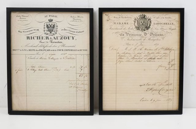 - RICHER & AUZOUY. [Facture de vente de tissus à Madame la marquise de CRILLON]. Feuillet in-4 (270 x 210 mm) sous verre et encadrement noir. Paris, le 17 décembre 1831. Facture de vente de la maison Richer & Auzouy, successeurs de Nourtier, marchands d'étoffes de soie et nouveautés, brevetés de sa majesté la Reine des Français et de la cour impériale de Russie, à Madame la marquise de Crillon, pour sept pièces de