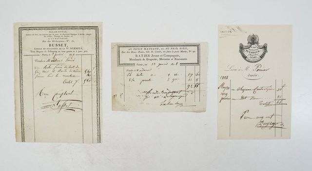 Lot de 3 factures pour des habits et des accessoires de mode.. Factures acquittées d’artisans et de marchands parisiens sous la Restauration, dont 2 adressées à M. Perrier. Paris, 1817, 1818 et 1829.