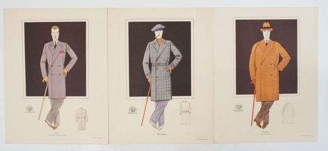 Maison URBI et ORBI. 3 modèles masculins coloriés au pochoir. [An...