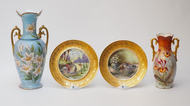 Deux assiettes décoratives en porcelaine dure émaillée et incrustation or à décor peint polychrome d'une scène de chasse à courre et d'un trophée de chasse, signées D.ROGER