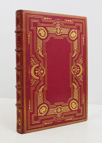 In-4, maroquin rouge, dos à nerfs orné de caissons à fleurons d'angle, belle plaque d'encadrement dorée sur les plats, doublure de maroquin crème encadrée de frises dorées, gardes de soie moirée rouge, pointillés dorés sur les coupes, tranches dorées, couv. conservées, chemise en demi-maroquin rouge avec titre doré et filets à froid sur le dos, étui bordé (Gruel).