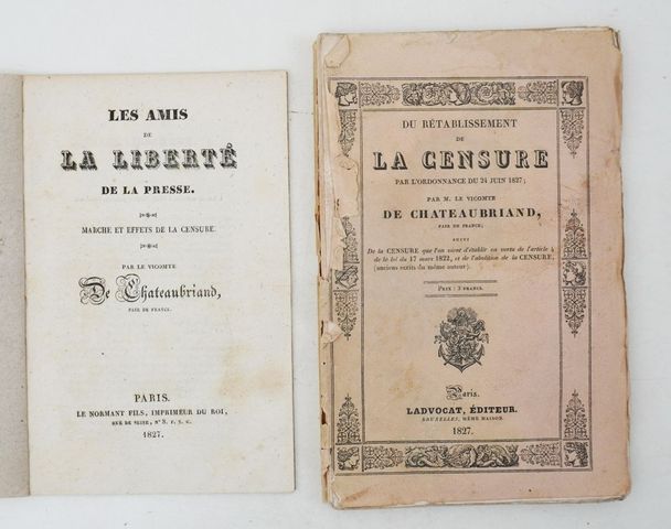 CHATEAUBRIAND (François René, vicomte de). Les Amis de la liberté de la presse. Marche et effets de la censure. Paris, Le Normant Fils, 1827.