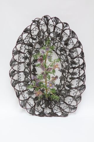 Importante couronne mortuaire à décor floral en fils de métal tre...