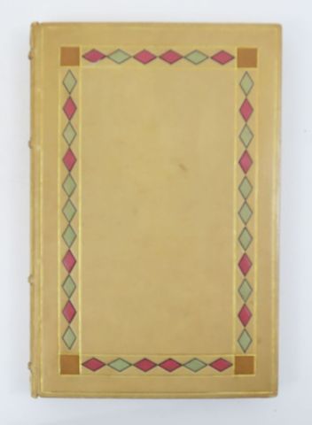 In-8 veau crème, encadrement sur les plats de losanges mosaïqués polychromes et de filets dorés, carrés mosaïqués aux angles, encadrement intérieur de filets doré et à froid et triangles mosaïqués en écoinçons, tête dorée, non rogné, couv. conservée (La Haye).