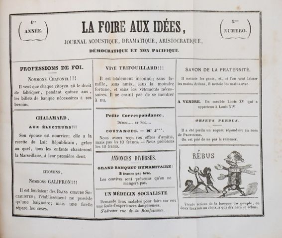 Foire aux Idées (La). Journal-vaudeville en plusieurs numéros. Rédacteurs-Gérants : MM. de Leuven et Brunswick. N° 1 (16 janvier 1849) à 4 (13 octobre 1849). Avec un placard dépliant dans les n° 1 et 2.