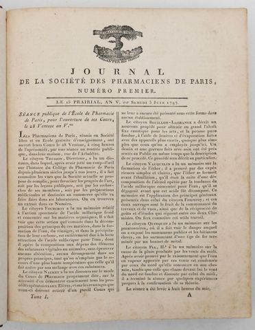 C'est tout ce qui a paru de ce périodique médical prestigieux auquel collaborèrent Fourcroy, Parmentier, Vauquelin, etc., mais qui ne parut que du 3 juin 1797 au 6 décembre 1799. Il s'agissait de l'organe officiel de la Société libre des pharmaciens de Paris, créée le 30 ventôse an IV [20 mars 1796] pour continuer l'antique Collège des pharmaciens, en l'accommodant un peu à la sauce des idées nouvelles, mais en conservant ses finalités : représentation de la profession, formation gratuite des élèves dans les locaux de la Rue de l'Arbalète, progrès des techniques. (Hatin, p. 582.)