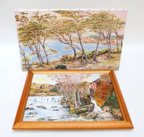 H.BARRIERE (XXeme siècle) Vue d'un village en bord de mer et mou...