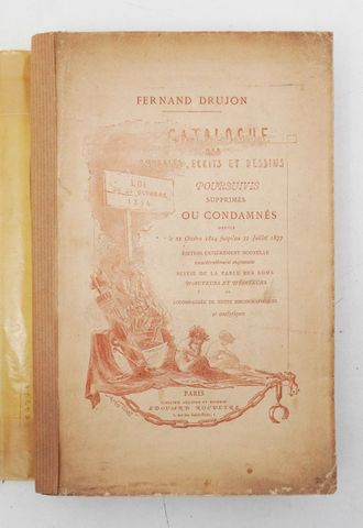DRUJON (Fernand). Catalogue des ouvrages, écrits et dessins poursuivis, supprimés ou condamnés depuis le 21 octobre 1814 jusqu'au 31 juillet 1877. Édition entièrement nouvelle, considérablement augmentée suivie de la table des noms d'auteurs et d'éditeurs et accompagnés de notes bibliographiques et analytiques. Paris, Édouard Rouveyre, 1879.