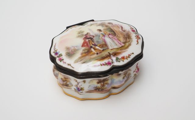 Boîte en porcelaine de style Louis XV, présentant un couple galan...