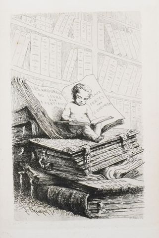FERTIAULT (F.). Les Amoureux du livre, sonnets d'un bibliophile, fantaisies, commandements du bibliophile, bibliophiliana, notes et anecdotes. Préface du bibliophile Jacob (Paul Lacroix). Seize eaux-fortes de Jules Chevrier. Paris, A. Claudin, 1877.