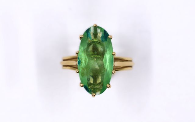 Bague en or jaune 750°/°° retenant une pierre verte de forme nave...