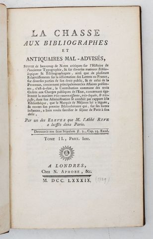 - La Chasse aux bibliographes et antiquaires mal advisés suivi de beaucoup de notes critiques sur l'histoire de l'ancienne typographie et sur diverses matières biologiques et bibliographiques ainsi que de plusieurs éclaircissements sur la réformation des lettres en France sur diverses parties de son droit public et de celui de la Provence [...] Tome II, part. Iere. Londres, N. Aphobe, &c., 1789. In-8 veau raciné, dos lisse orné, p. de titre et de tomaison en mar. rouge, filets et roulette dorés encadrant les plats, tr. marbrées (rel. légt post. c. 1800). Très rare. Second volume ne contenant que la préface, l'errata et la table très détaillée du premier volume (ici manquant). "L'auteur est annoncé dans le titre comme un élève de l'abbé Rive mais il est trop aisé de reconnaître cette abbé lui-même au ton cynique de sa critique, à la bizarrerie et aux incorrections de son langage, surtout à la grossièreté des injures contre plusieurs bibliographes estimables et de mérite ; il est possible de rencontrer par hasard au milieu de cet amas confus de minutie et dans l'active quelques observations exactes ou quelques particularités curieuses mais c'est acheter une bien mince instruction par trop de dégoût et d'ennui." Quérard (VIII, 63.)
