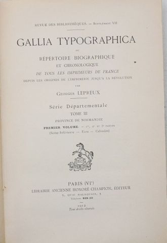 Normandie - LEPREUX (Georges). Gallia typographica ou Répertoire biographique et chronologique de tous les imprimeurs de France depuis les origines de l'imprimerie jusqu'à la Révolution. Série départementale tome 3 - Province de Normandie. Paris, Champion, 1911.
