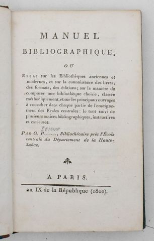 PEIGNOT (Gabriel). Manuel bibliographique ou Essai sur les bibliothèques anciennes et modernes et sur la connaissance des livres, des formats, des éditions ; sur la manière de composer une bibliothèque choisie, classée méthodiquement et sur les principaux ouvrages à consulter dans chaque partie de l'enseignement des écoles centrales ; le tout suivi de plusieurs notices bibliographiques instructives et curieuses. Paris, sn, An IX de la République (1800).