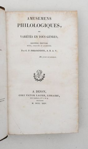 PHILOMNESTE (Gabriel PEIGNOT, dit G. P.). Amusemens philologiques, ou Variétés en tous genres ; seconde édition, revue, corrigée et augmentée. Dijon, Victor Lagier, 1824.