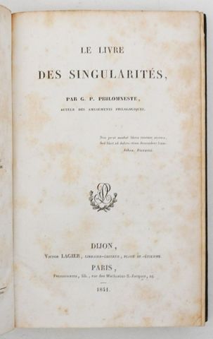 PHILOMNESTE (Gabriel PEIGNOT, dit G. P.). Le Livre des Singularités. Dijon, Lagier, Paris, Pelissonnier, 1841.
