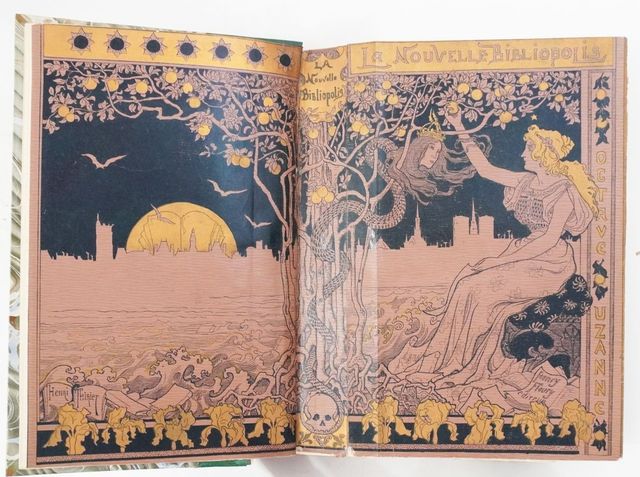 UZANNE (Octave). La Nouvelle Bibliopolis. Voyage d'un novateur au Pays des Néo-Icono-Bibliomanes. (Les Évolutions du Bouquin.) Lithographies en couleurs et marges décoratives de H. P. DILLON. Frontispice à l'eau-forte d'après Félicien ROPS. Nombreuses illustrations dans le texte et hors texte. Paris, Henri Floury, 1897.