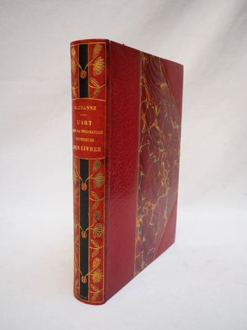 In-4 demi-maroquin rouge à coins, dos lisse joliment orné d'un décor mosaïqué d'une bande verticale de mar. noir et de fleurs de lotus en mar. crème et vert clair, titre doré, filet doré sur les plats, tête dorée, couv. ilustrée dépliante conservée (V. Champs).