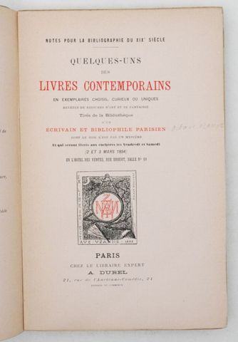[UZANNE (Octave)]. Notes pour la bibliographie du XIXe siècle. Quelques-uns des livres contemporains en exemplaires choisis, curieux ou uniques, revêtus de reliures d'art et de fantaisie, tirés de la bibliothèque d'un écrivain et bibliophile parisien dont le nom n'est pas un mystère et qui seront livrés aux enchères le vendredi et samedi (2 et 3 mars 1894) dans l'Hôtel des ventes rue Drouot, salle n° 10. Paris, A. Durel, [1894].